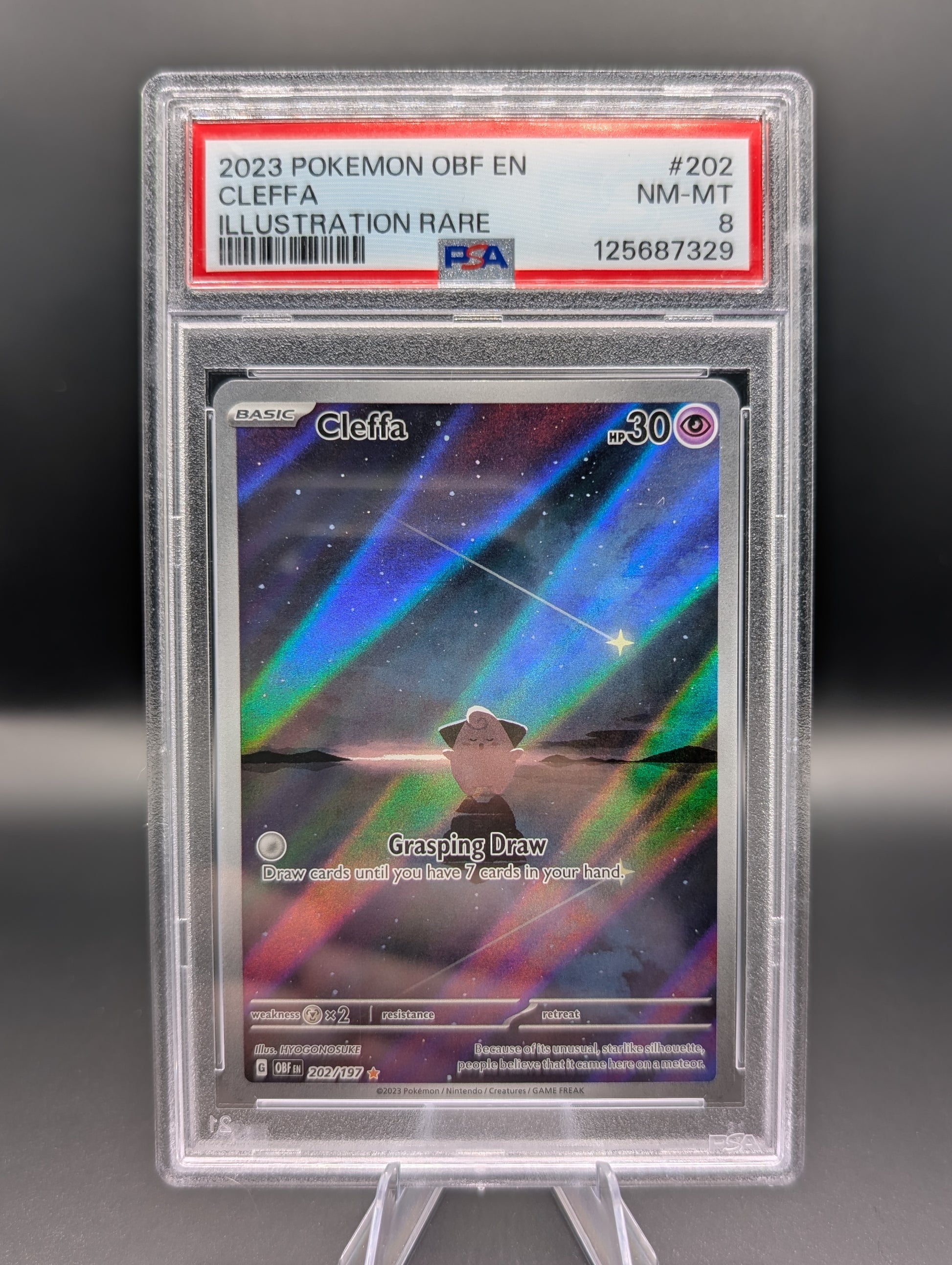 This listing is for a Cleffa – Illustration Rare #211/197 from the Scarlet & Violet: Obsidian Flames expansion, graded Near Mint – Mint 8 by PSA.